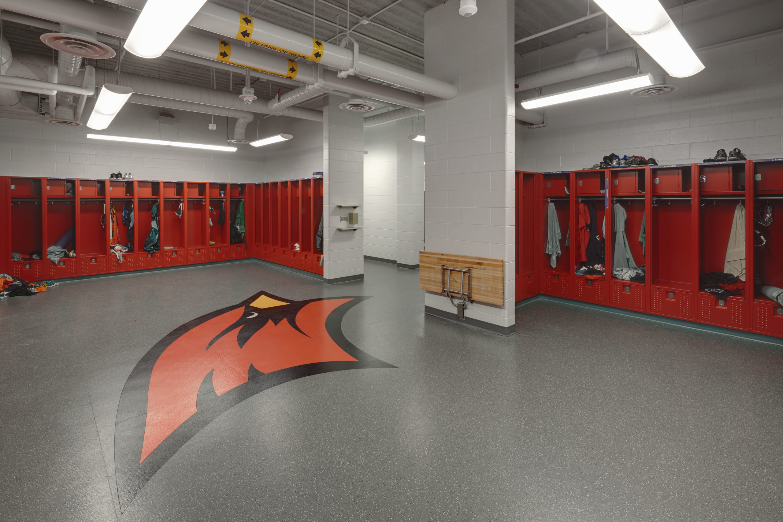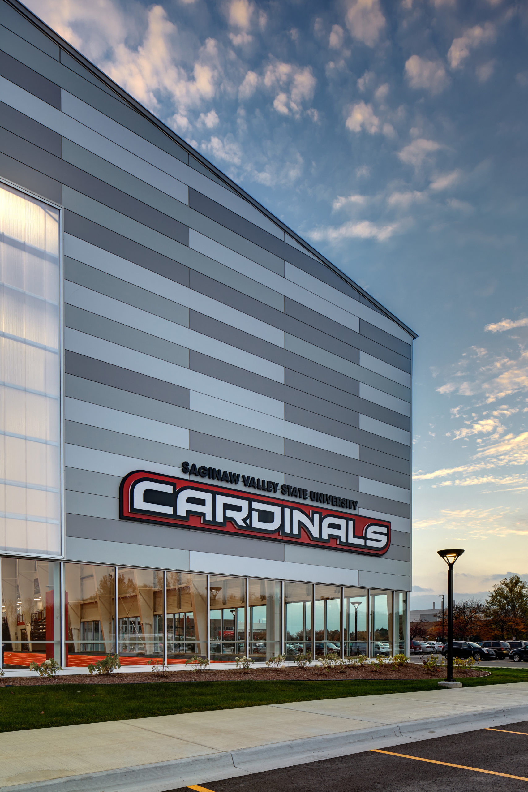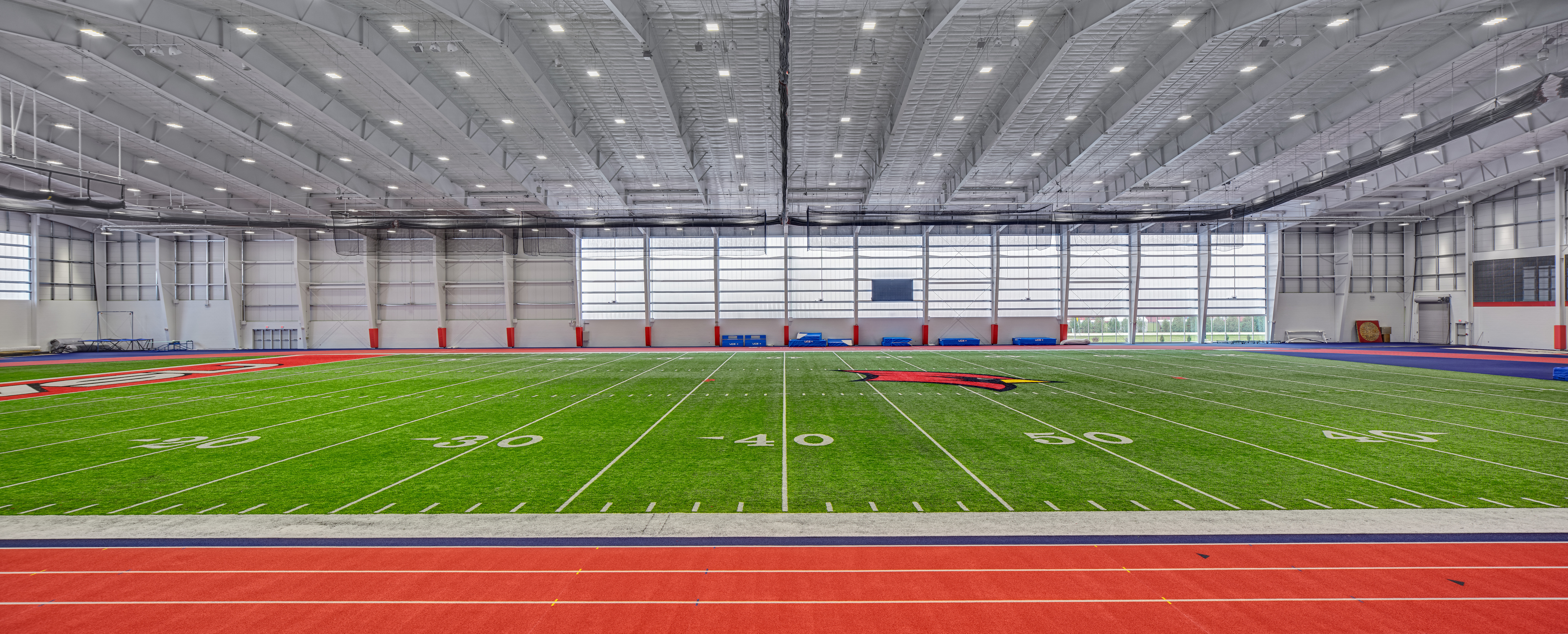 This indoor athletic practice facility for Saginaw Valley State University is a 245’ clear span with 46’ low eave height and 66’ ridge elevation. The building features a 300-meter indoor track with a synthetic surface covering the infield for baseball, softball, football and soccer. The building has a mixture of horizontal and vertical insulated wall panels, translucent wall panels and brick. For aesthetic appeal, the insulated metal wall panels were designed within a standard color range to create a staggered pattern along the facade. The roof was installed over the Simple Saver Insulation System.